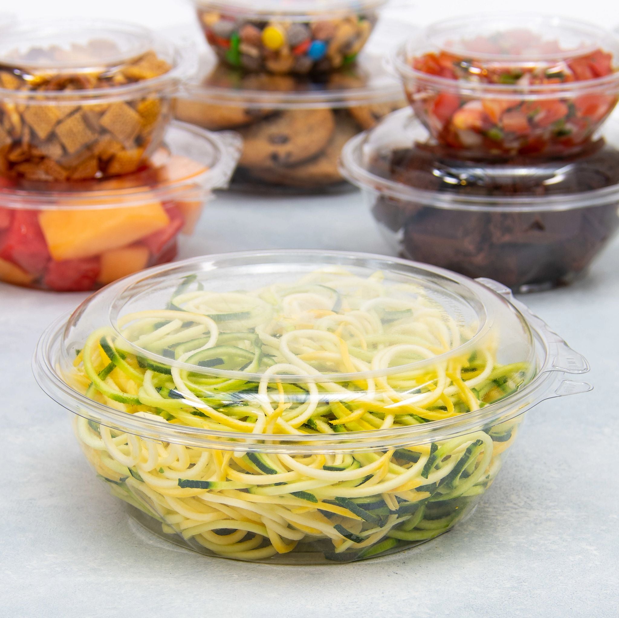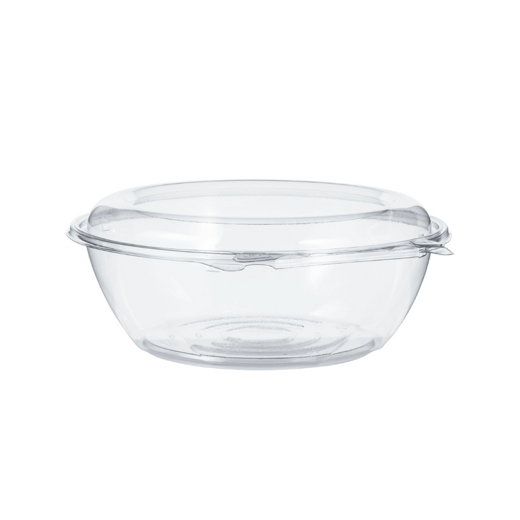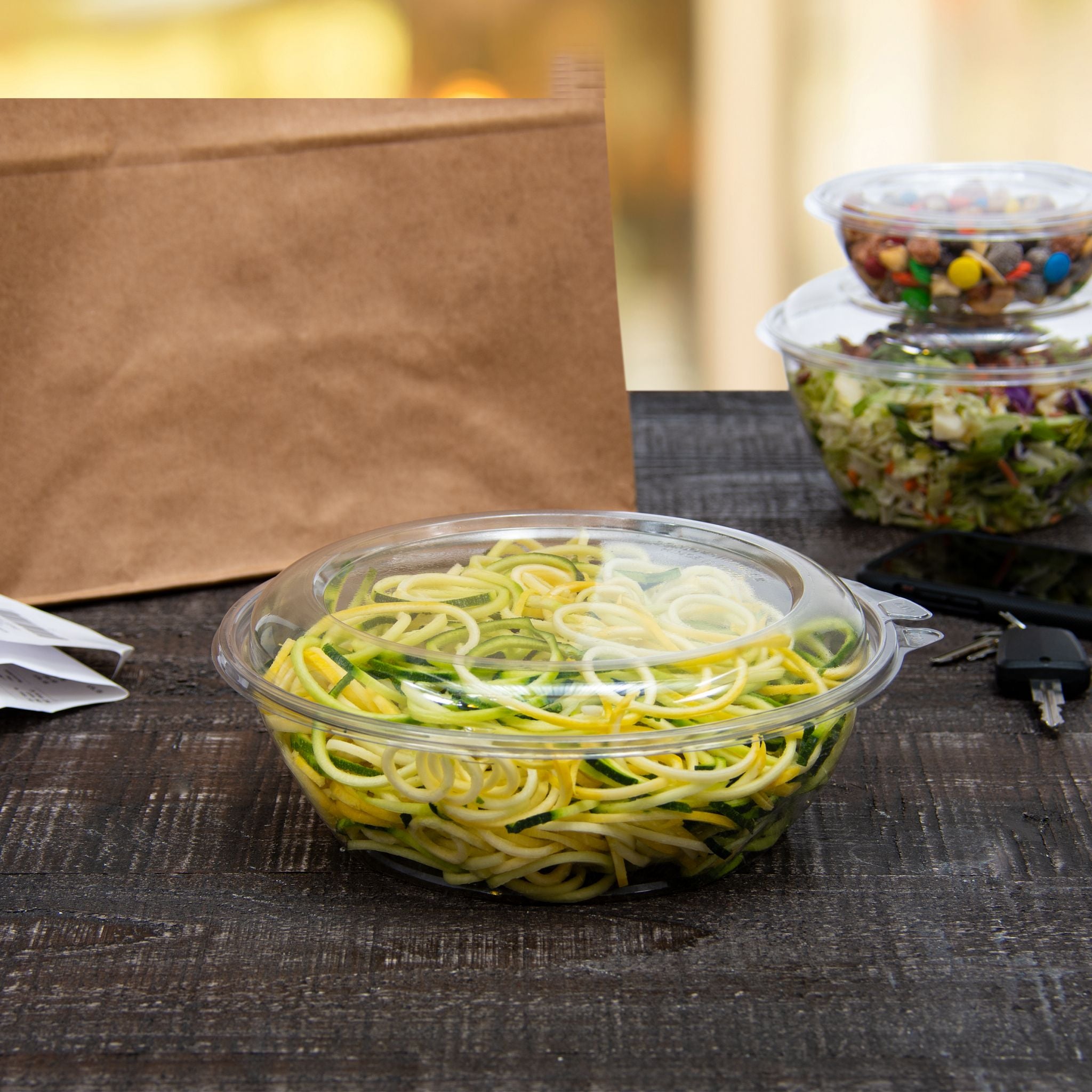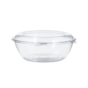 No matter what's inside, SafeSeal™ bowls keep your food safe, secure and looking good! Designed to prevent tampering without shrink bands or extra wrapping, SafeSeal bowls make sharing food easy. The complete perimeter seal preserves freshness and prevents leaks and spills. The TamperAlert Hinge™ has a visible seal that, if broken, makes it obvious the container has been opened. The specialty lid inhibits the ability to lift it from the base without tearing the hinge. Once the seal is broken, the now two-piece container is easy to re-close and continues to be leak-resistant. Crystal clarity and secure closure allow what's in your bowl to be the star of the show. These 48 oz stackable bowls are perfect for restaurants, bakeries and delis! They're even great for at-home use. Transport salads, fruits or desserts to your next picnic, potluck or bake sale. Ensure quality with SafeSeal by Dart®! Made of recyclable PET; check locally, may not be recycled in your area.